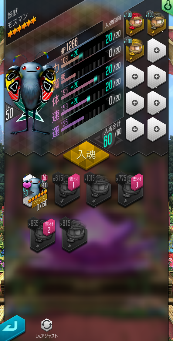 在「入魂」中將御魂汁設定為素材時,將可一併選取所有御魂汁。